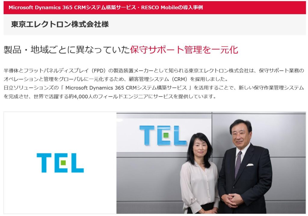 株式会社日立ソリューションズが提供する「Microsoft Dynamics 365 CRMシステム構築サービス」と連携アプリ「RESCO Mobile」によって、営業上の問題を解決した東京エレクトロン株式会社の事例について紹介します。
