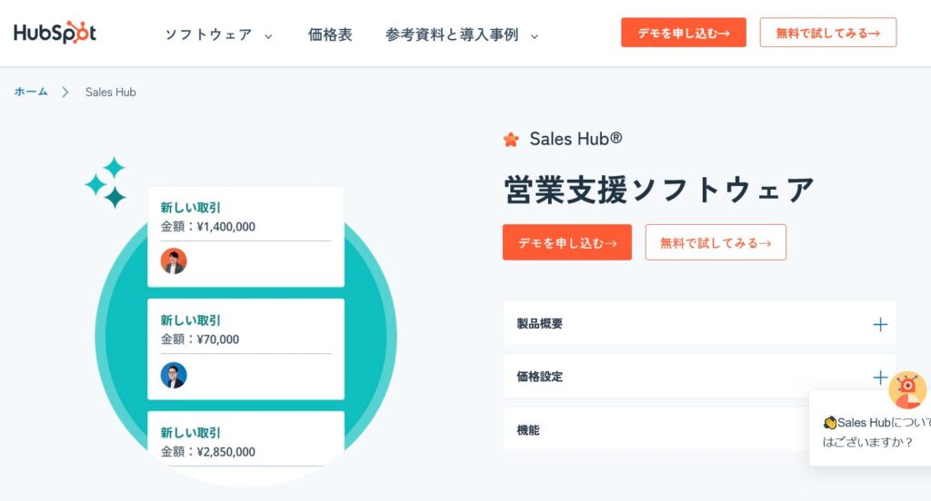 | HubSpot Sales Hub | HubSpot, Inc. | インバウンドマーケティングに強みを持つ低コスト多機能案件・商談管理システム 無料プランでも充実した機能を持ち、初期費用を抑えられる |