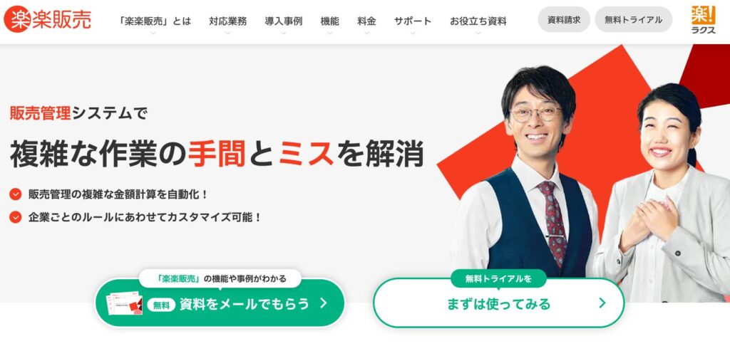 | 楽々販売 | 株式会社ラクス | マウスだけで直感的にExcelをデータベース化できるシンプルな案件管理自動化システム | 初期費用 150,000円 利用料 月額 70,000円 ※代表的な料金プラン ※実際の料金組み合わせについては要資料請求 |