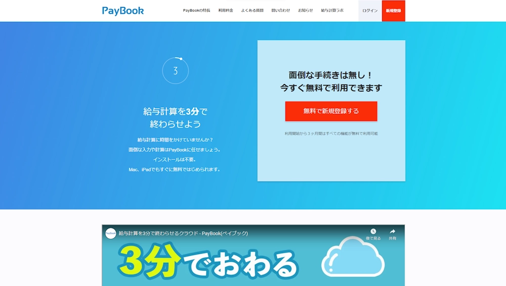 PayBookは、従業員数10名まで無料で利用できる、クラウド型の給与計算システムです。