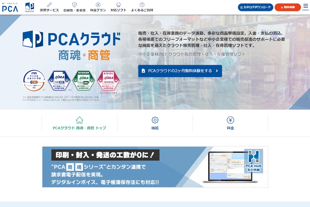 PCAクラウド 商魂・商管は、ピー・シー・エー株式会社が開発・販売しているクラウド型の販売管理・仕入・在庫管理ソフトです。