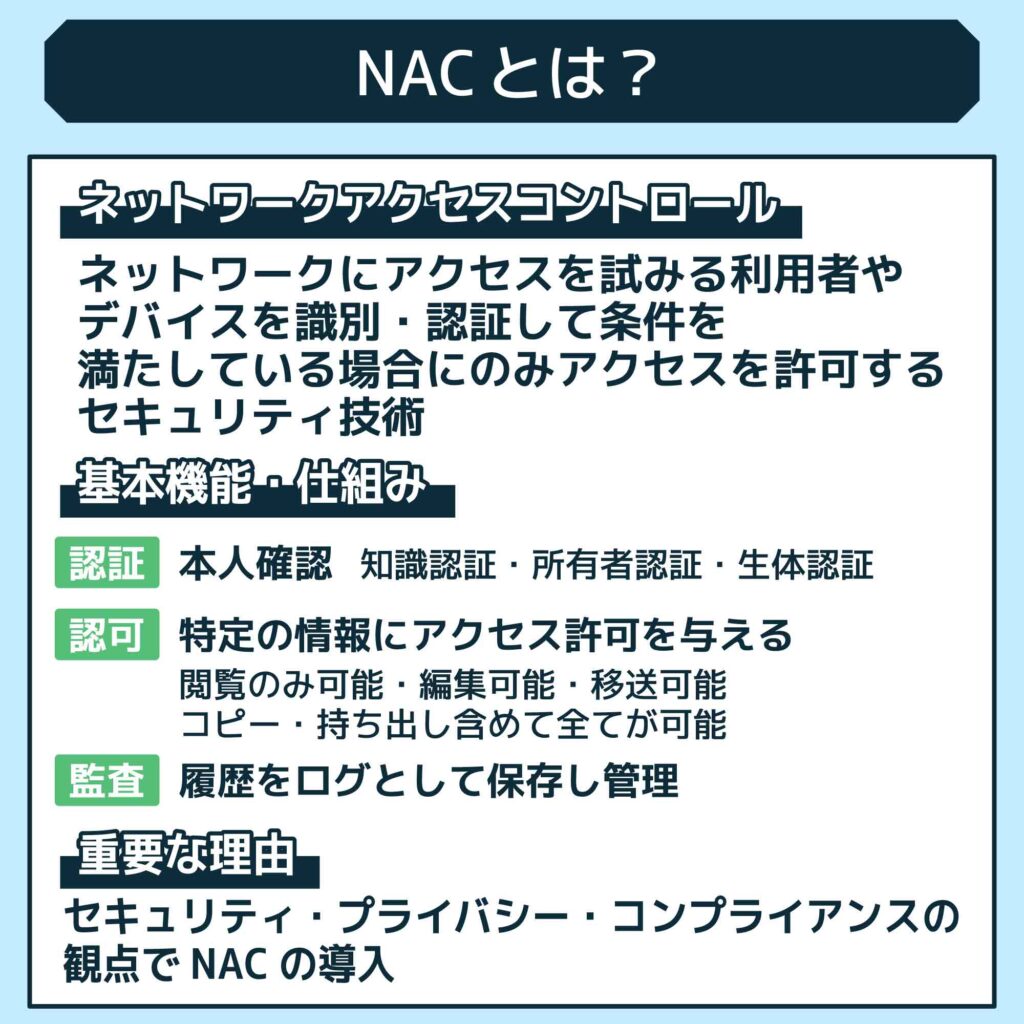 NAC(ネットワークアクセスコントロール)は、ネットワークにアクセスするユーザーやデバイスに対してアクセス制限をかけることでネットワークの安全性やセキュリティリスクの軽減ができる仕組みです。