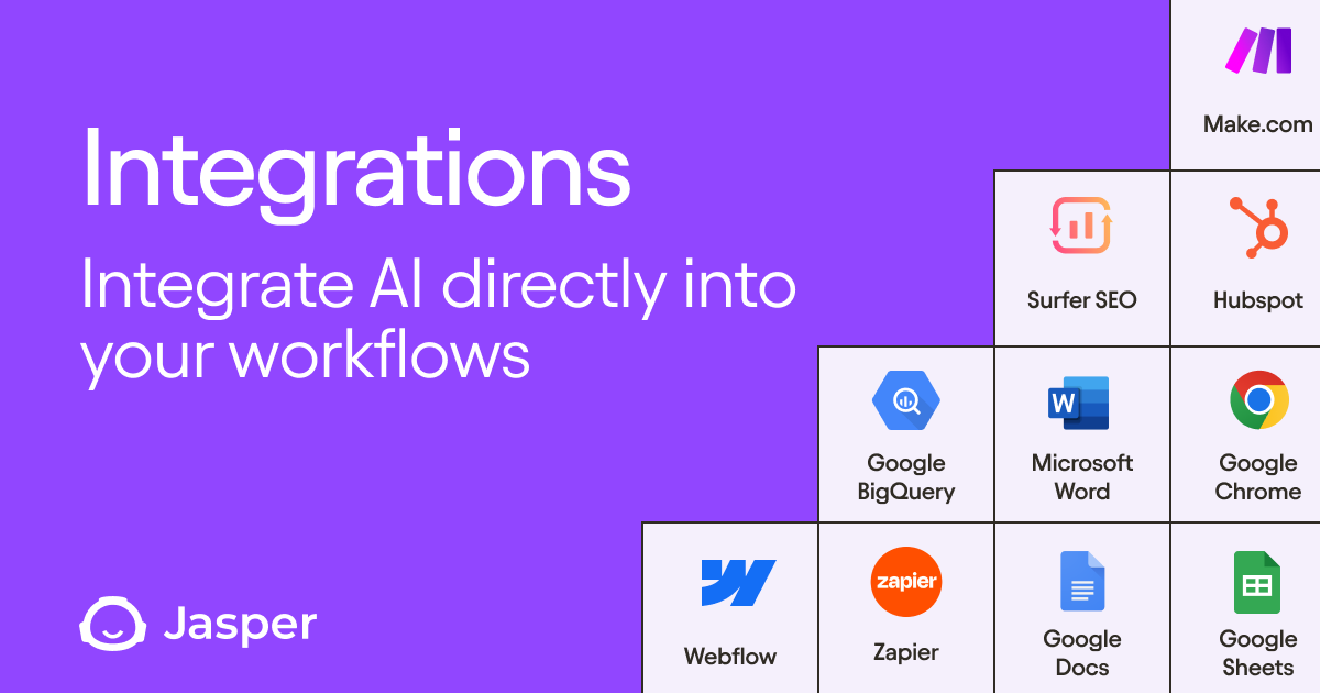 Jasper AIは他のプラットフォームやツールとの連携機能が豊富に揃っているため、Surfer SEOとの統合によって初心者でも簡単にSEO最適化が施されたコンテンツを作成することなども可能となっています。