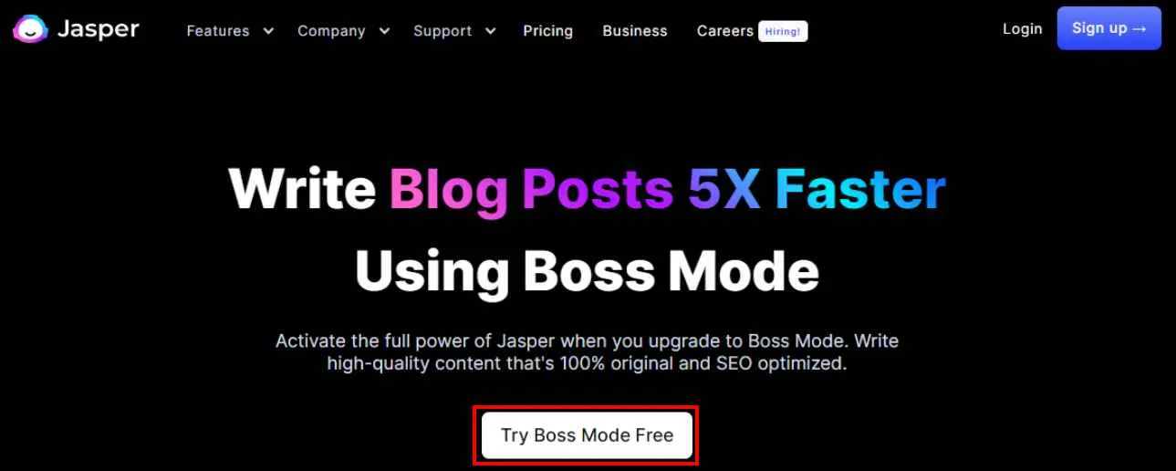 Jasper AIの「Boss Mode」は、SEOに最適化された文章コンテンツを通常の5倍のスピードで作成できる機能で、デジタルマーケティング担当者やブログ記事などを執筆するライターにとって便利な機能です。