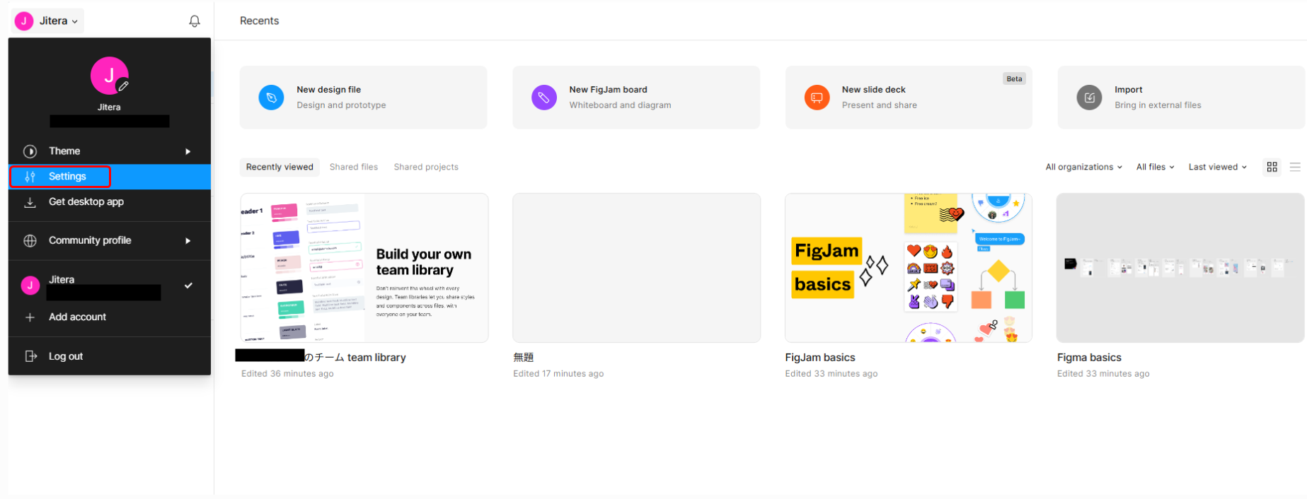 Figmaのアカウント作成が完了したら、設定から言語を日本語に変更します。